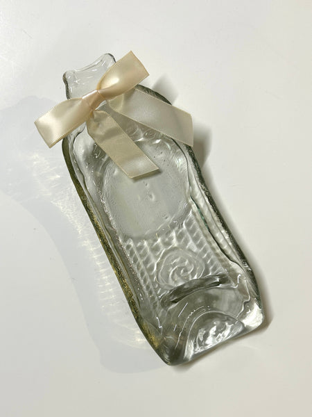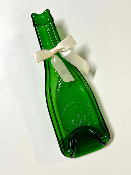 This melted glass bottle can be used as a spoon rest, nut platter, or olive plate!