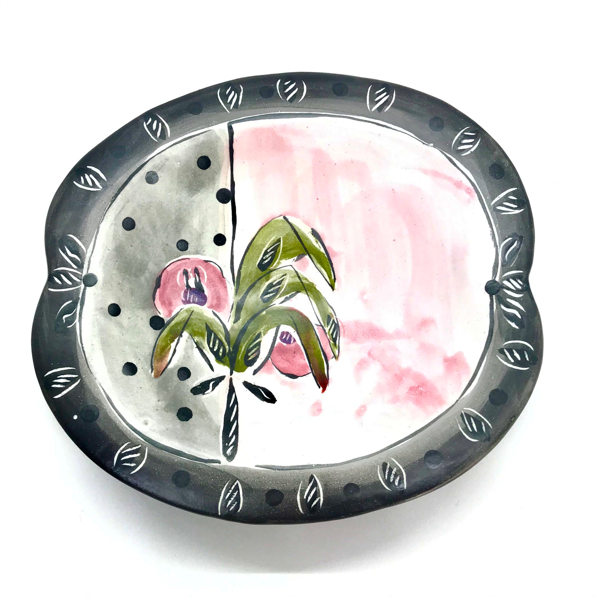 contrast to her painterly surface. The pots are majolica on terra cotta.