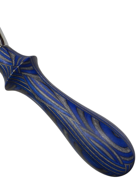 Handmade pizza cutter with a layered wooden handle.