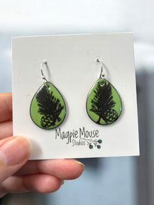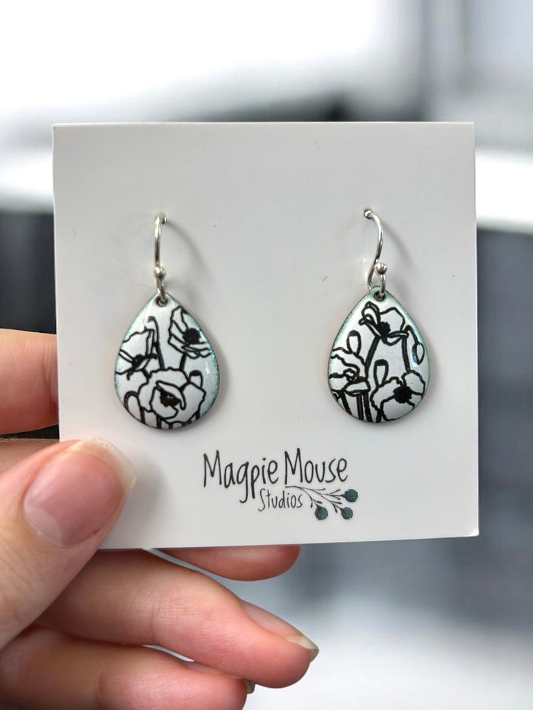 Enamel kiln fused to copper on sterling silver ear wires.